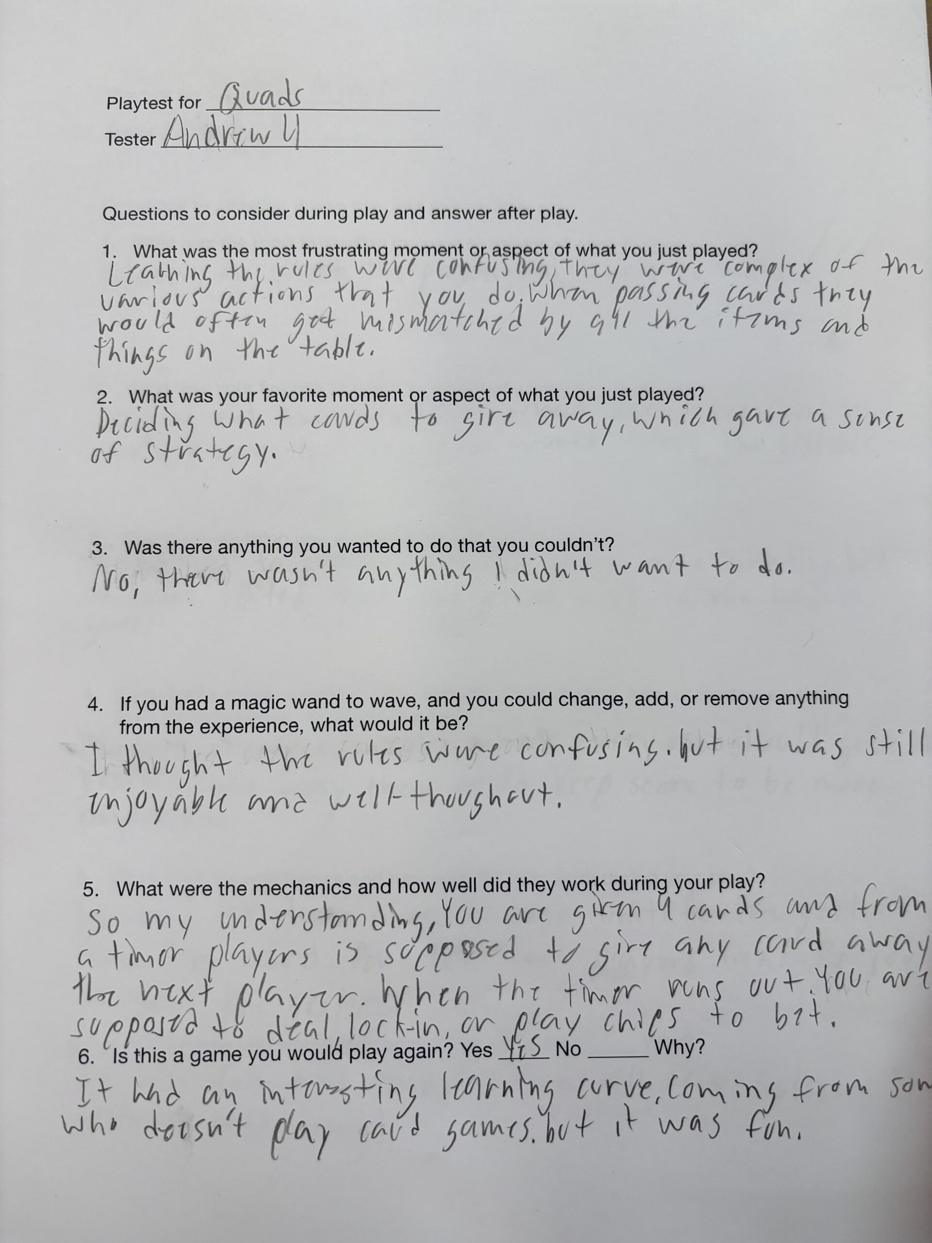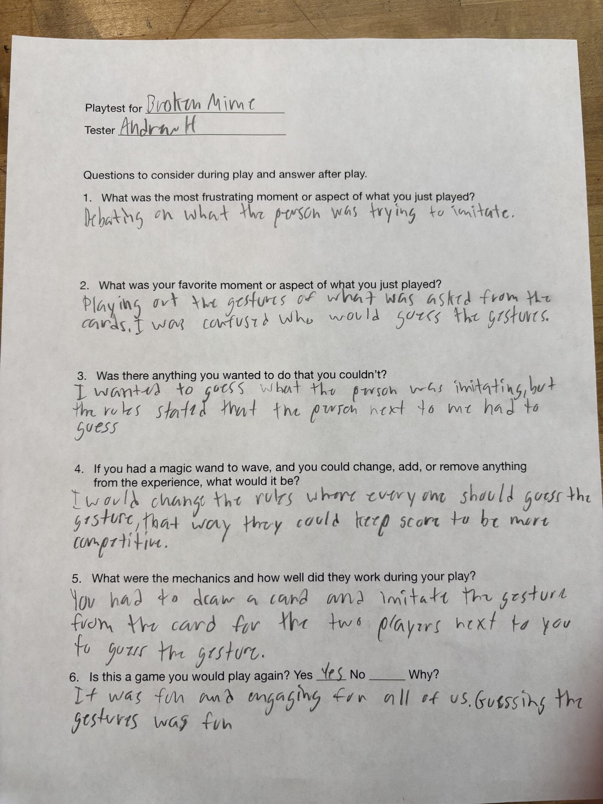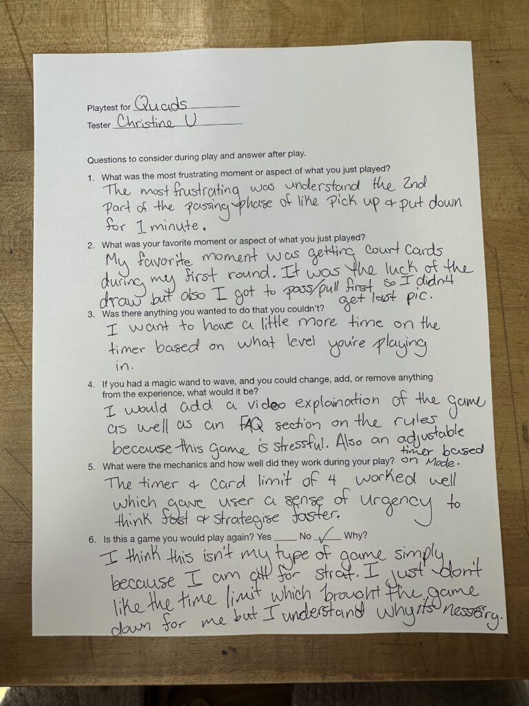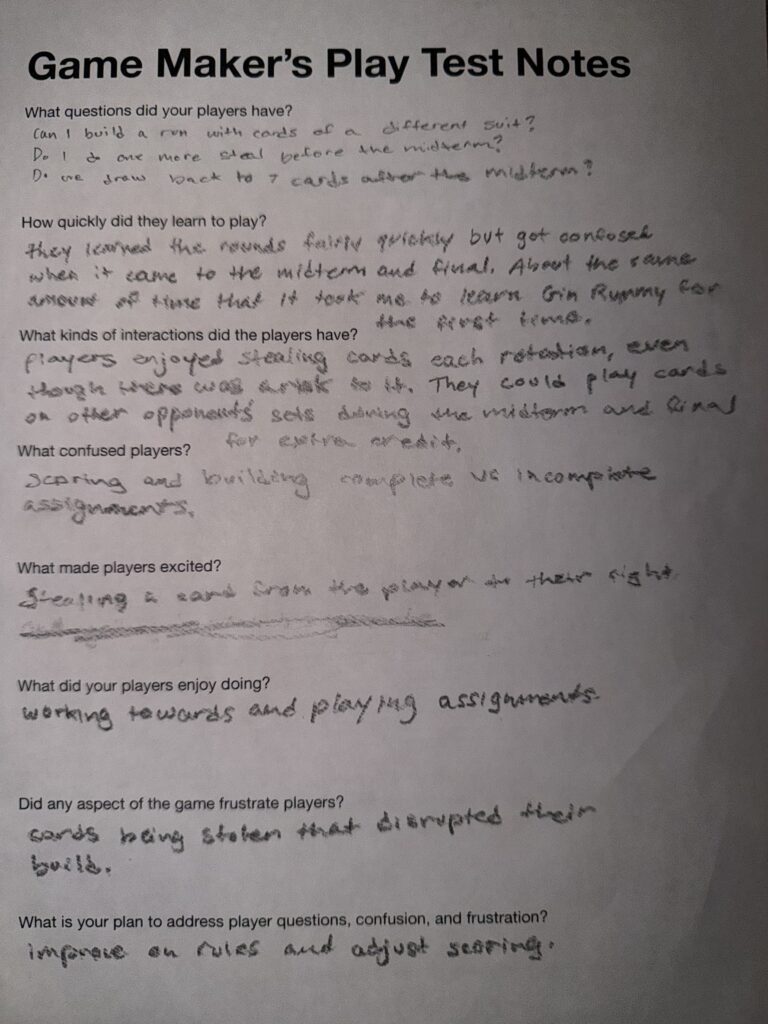 Honestly, this was the first game I’ve played in this class where there wasn’t anything I wished I could do differently. The game felt complete in its mechanics and objectives. I just wish I had been a little faster in picking up the rules, which would have allowed me to dive into strategic planning sooner.