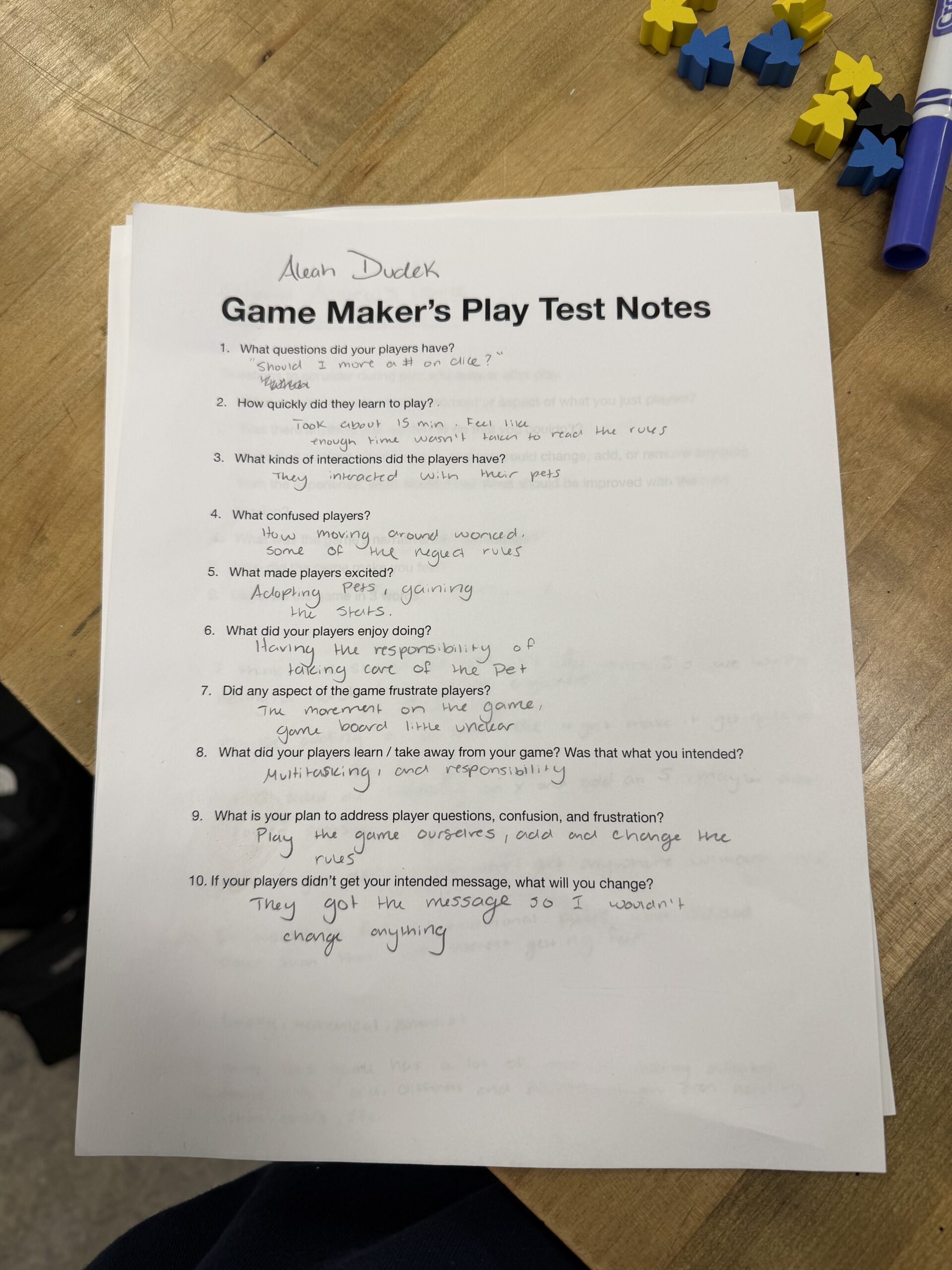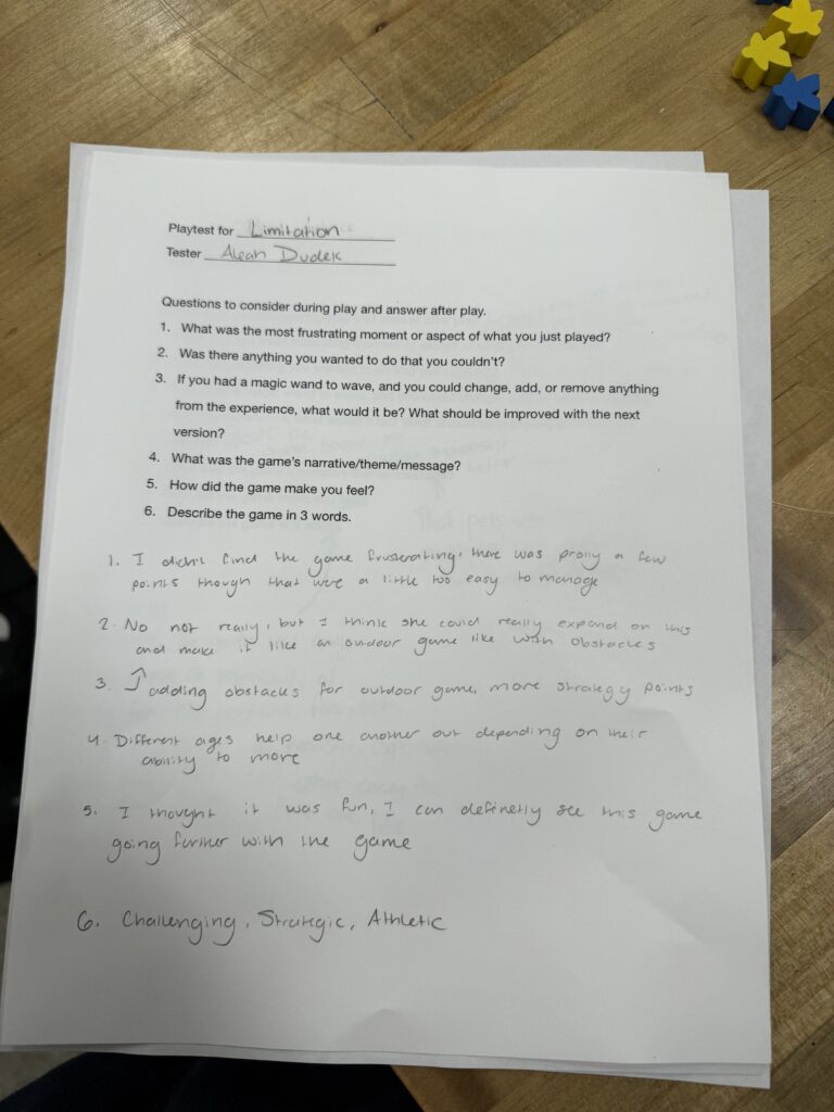 What would I change? I would add in spaces on the board that benefit each color in a different way to get to the center faster. I would also maybe consider using two different die. One for the direction and the other for the amount you move.