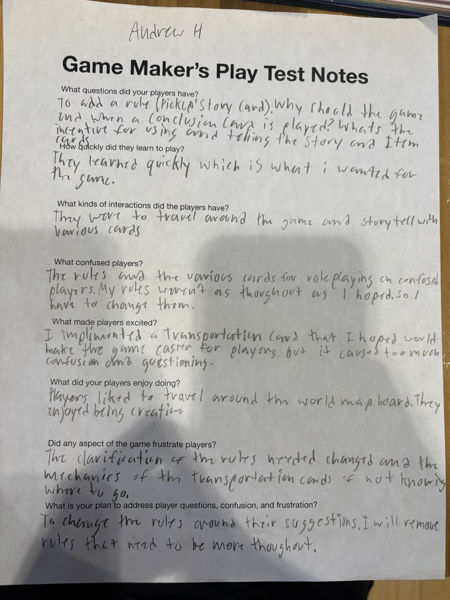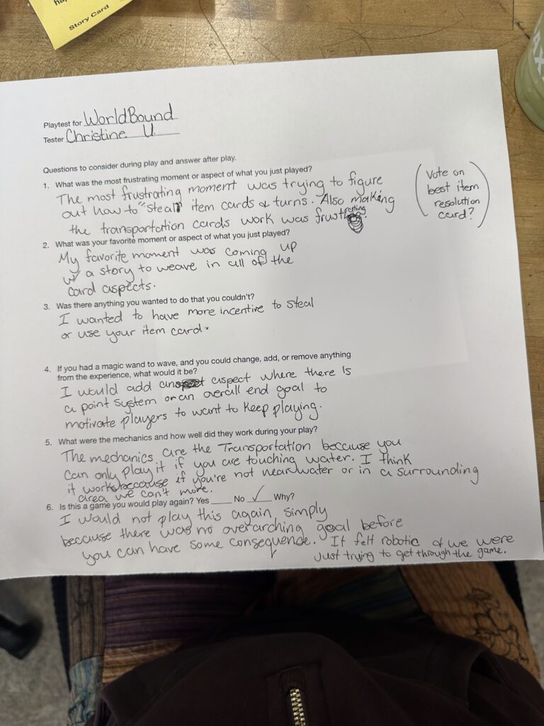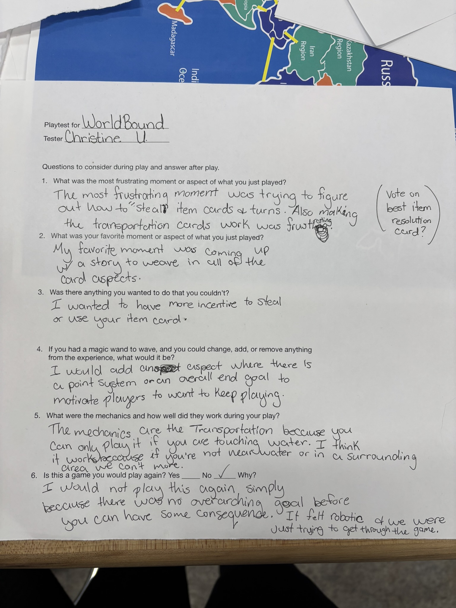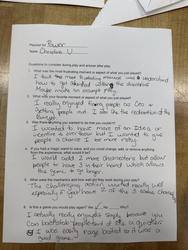 - What was the most frustrating moment or aspect of what you just played? In my opinion, the game felt much too much like poker, and therefore didn’t feel very compelling to me.