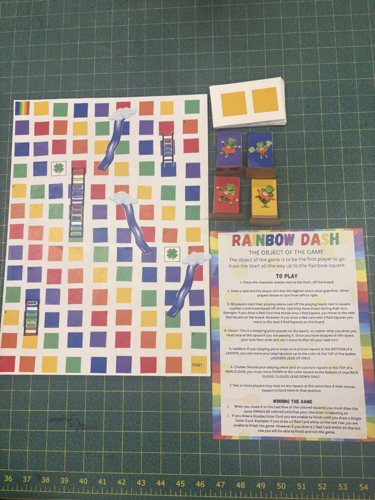 - Chutes and ladders with a small rainbow twist. Draw a card to move your pieces farther up the board. Try to avoid Slides and Clovers but try to get on a ladder space to move farther.