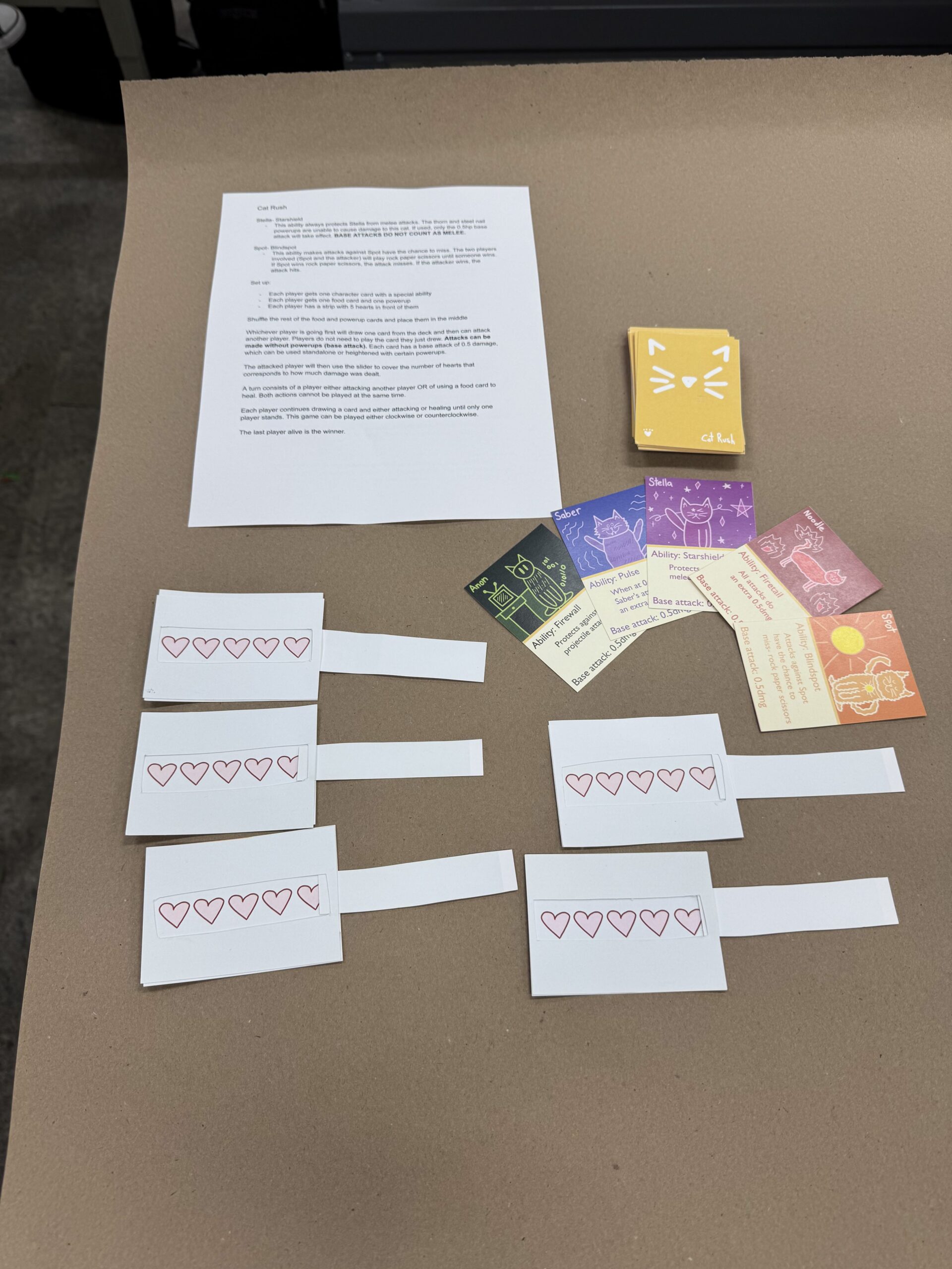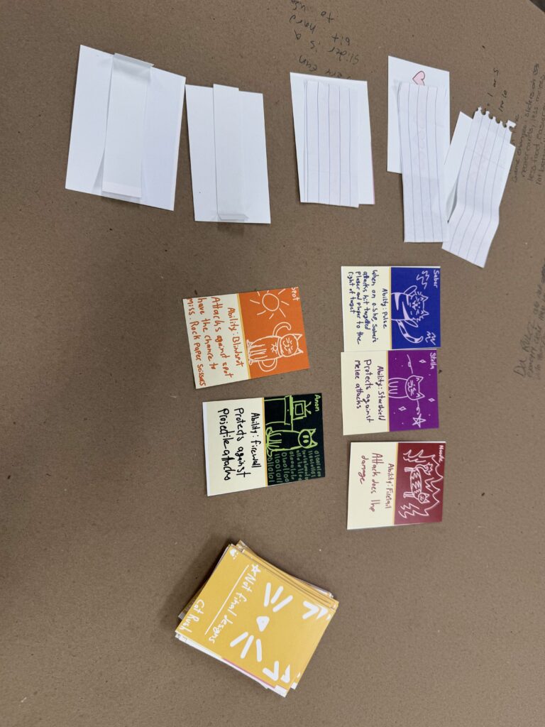 My game is similar to Pokémon, but if it were all cats. The goal is to attack other players and be the last cat standing. It is a mix of luck and skill to use powerups to your advantage and heal using the limited supply of food available. In version 2 of my game, I made the rules a lot more clear surrounding each character’s abilities and how the powerups work. Along with this, I also cut the amount of food cards in half. The first playtest showed me that I was too unclear on some aspects, such as being able to use the base attack by itself. The most helpful comments were about the food supply as well as questions surrounding some of the rules. For version 3, I would make everything into whole numbers and attempt to fix the health sliders again. Along with this, I would add different colored backs for the character and heart cards to keep them better separated from the deck.