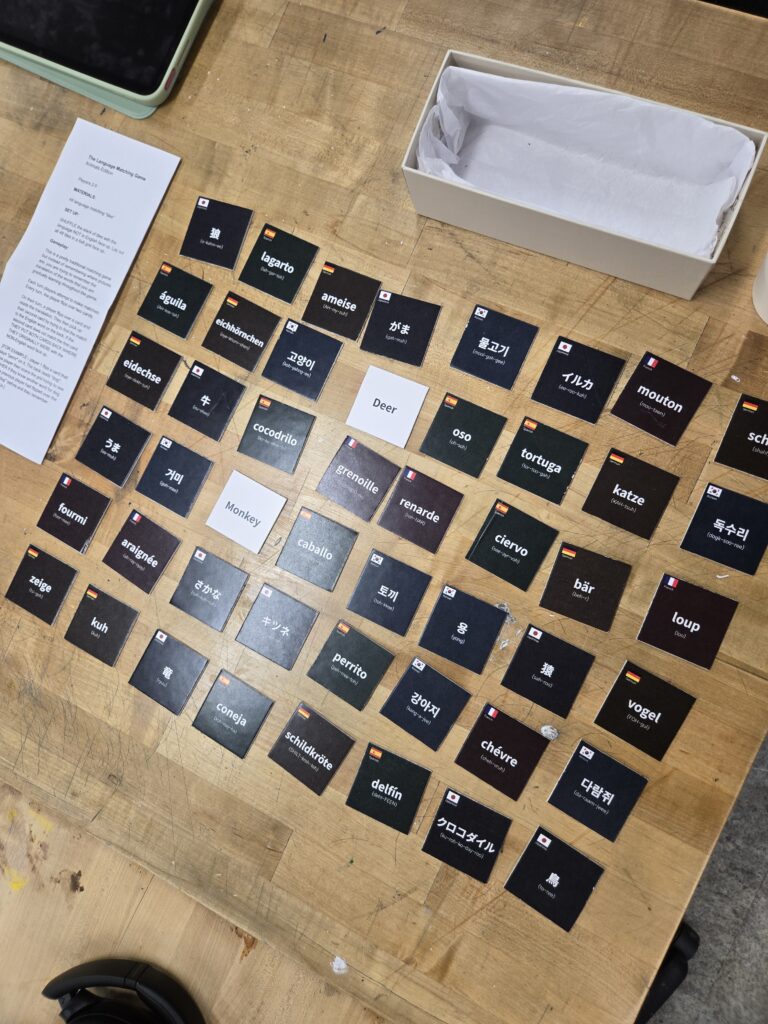 At the end of the traditional matching game, shuffle all tiles back together and designate one player to flip the tiles over in front of all players with non-English side face up. Once the stack runs out, see who correctly remembered (or guessed) the most English translations!